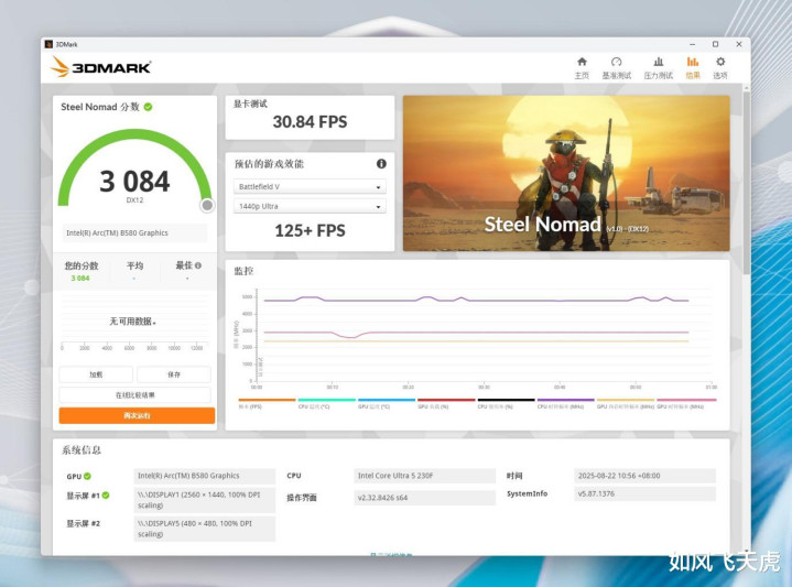 再来看看游戏,3DMARK Steel Momad 3084分,战地五预计帧数125+。