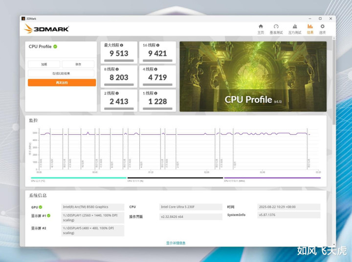 看看这款CPU的体质如何,运行3DMARK CPU Profile,单线程1228,最大线程9513。